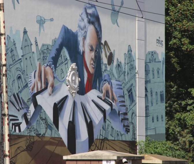 Bonn nous accueille avec un pignon de maison peint en l’honneur de Beethoven qui est né ici. Cette fois-ci, nous ne traverserons pas le Rhin par un bac mais, pour prendre le pont, nous empruntons une piste cyclable en hélice qui permet d’y accéder : ce sera "la forte pente du jour" !