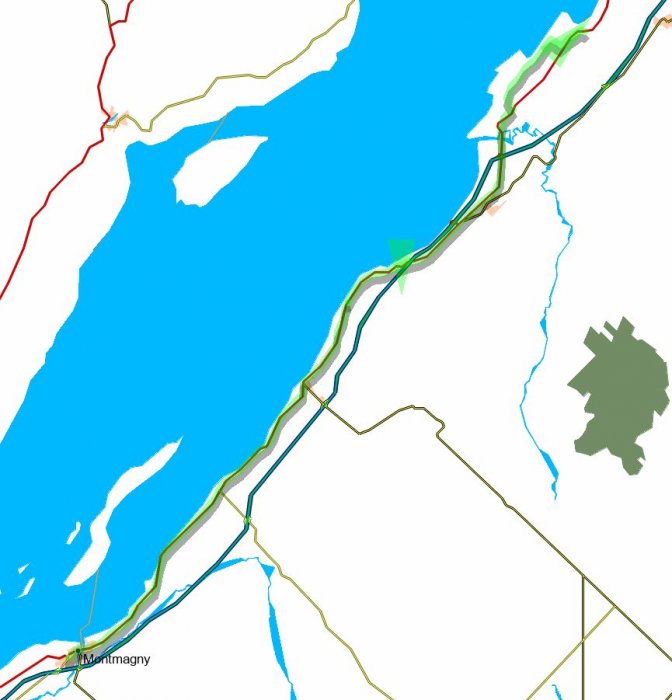 - Montréal (boulevard Levesque) > Promenade du Vieux Port > embarcadère (traversier vers Longueil) > Boucherville > Varennes > Verchères > Contrecoeur > Sorel-Tracy