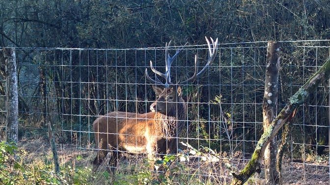 Toutes les photos ont une histoire : La clôture a deux mètres a poussé depuis peu de temps. Le grand cerf a sans doute voulu reprendre son itinérance en longue distance comme tous les ans mais il rencontre cet obstacle qu’il ne sait comment franchir. Sa perplexité est telle qu’il se laisse approcher pendant qu’il observe interrogatif certainement mais très inquiet à coup sûr l’espace forestier de l’autre côté, espace qui lui est devenu définitivement inaccessible. Il finira probablement ses jours dans quelques semaines sous les tirs des chasseurs qui s’enorgueilliront de leur tableau de chasse.