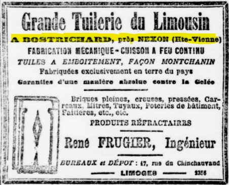 A coté de son activité dans la porcelaine il se lança dans la fabrication de tuiles et de briques sur sa proprété de Bostrichard. Le village est situé sur la commune de Meilhac mais pour la publicité René FRUGIER indiquait « près de Nexon ». La terre glaise était extraite aux Blas et elle était acheminée par des charettes tirées par des chevaux et des wagonnets sur rails.