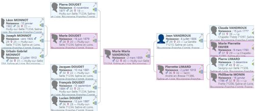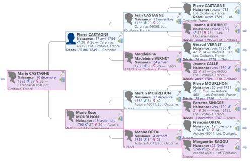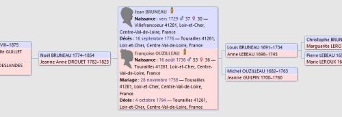 - Les communes de naissance et de décès de chacun des ancêtres bénéficient d’une courte description extraitede Wikipedia (avec lien vers l’article complet)