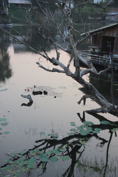 Cela semble une eau stagnante mais il s’agit bien de la rivière Kwaï juste avant qu’elle passe sous le célèbre pont de la vie de chemin de fer.