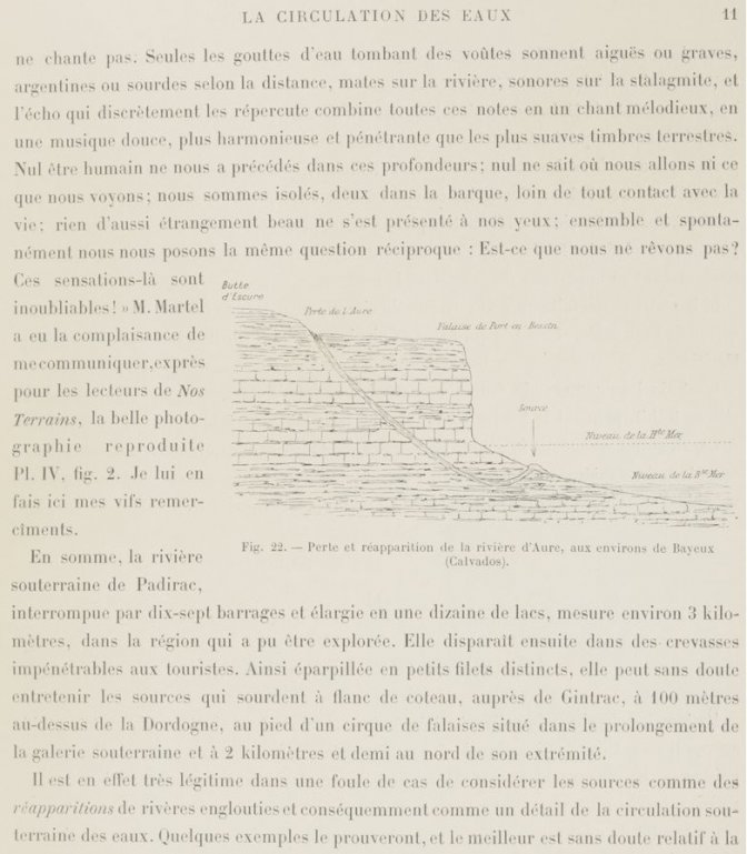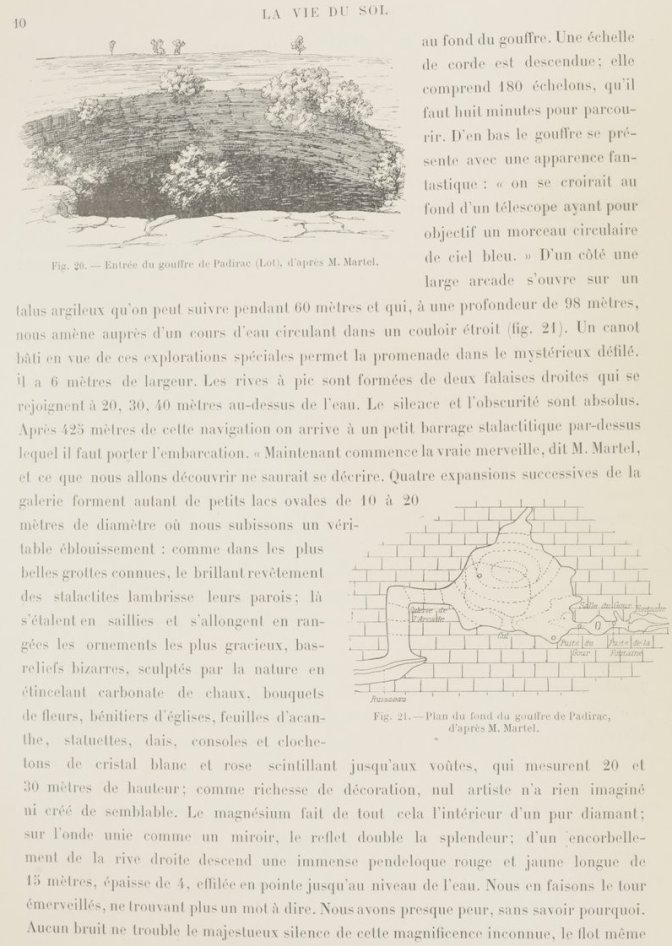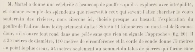 Dans Gallica, j’ai trouvé le livre de Stanislas Meunier qui contient l’un des récits d’exploration et résume les connaissances d’alors (1898) surtout vu du côté des résurgences. De nos jours, s’il existe une communication de l’eau vers les sources de Gintrac, il est bien connu que c’est la fontaine Saint-George, située au-dessous du village de Montvalent qui constitue la résurgence principale. Montvalent est aussi une commune (paroisse plutôt) très liée à l’histoire de mes ancêtres.