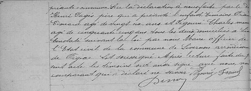 - Le 14 mai 1920, le trbunal de Cahors rend un jugement déclaratif de décès. La grosse de ce jugement fixe le décès à la date du 15 novembre 1920 sur le registre de la mairie de Blars