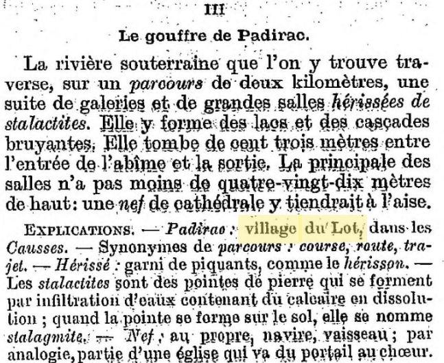 Padirac viendrait donc d’une expression occitane signifiant "parcours hérissé". Par ailleurs, j’ai entendu un amateur d’histoire locale sous-entendre que cela viendrait de l’expression occitane "un saut de rocher". Quant à Wikipedia, l’encyclopédie explique : "Le toponyme Padirac est basé sur l’anthroponyme latin ou roman Palerius." [3]