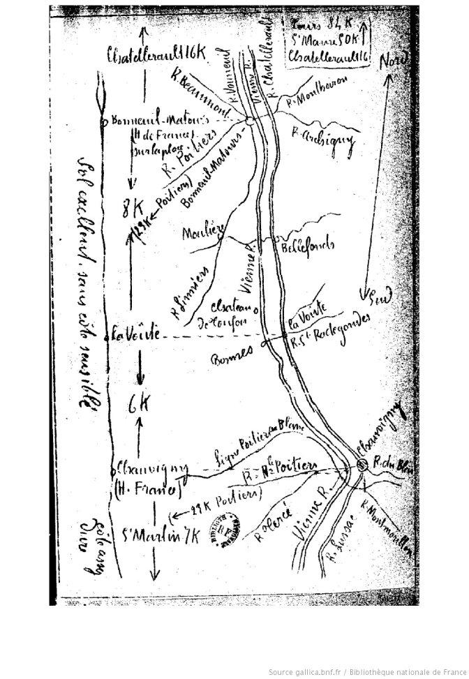 Les Pyrénées et l’Auvergne à bicyclette : Chartres à Gavarnie par Bordeaux, retour par Clermont, Briault (18..-19..? ; professeur au lycée de Chartres), Éditeur : Impr. industrielle et commerciale (Chartres), 279 pages, 1895 => consultation en ligne, publié le 15/10/2007, consulté le 01/04/2016.Voici l’itinéraire qu’il s’était donné pour les trois semaines dont il disposait (page 4) : "Chartres à Gavarnie, par Poitiers, Bordeaux-Tarbes, avec retour par Toulouse, Figeac-Aurillac, Clermont et Limoges". Avec comme première étape Chartres-Poitiers qu’il "voulait franchir rapidement" parce qu’il connaissait la route "dans tous ses détails".