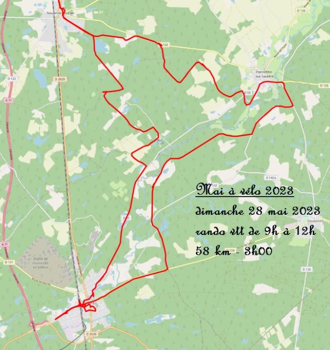 Ce matin, c’est rando vtt VTT Vélo Tout Terrain dans le cadre de Mai à vélo. Comme tous les cyclos du club semblent se désister, je crains fort, en quittant la maison, de me trouver bien seul. Je patiente jusqu’à neuf heures dix mais je ne vois personne venir au rendez-vous traditionnel et maintenant bien connu. Sans doute qu’en ce long week-end de Pentecôte, tout le monde est de sortie... Je pars donc seul et décide de faire le parcours 3 de la base vtt VTT Vélo Tout Terrain de Salbris. J’en ai déjà fait des portions mais jamais en suivant le fléchage (il n’était pas terminé ai-je cru comprendre début avril) et jamais en totalité (et en une seule fois). J’espérais que le fléchage serait à la hauteur et ce fut le cas sauf dans Salbris (le siège de la base !), ville dans laquelle le fléchage est catastrophique. Je perds un quart d’heure à rechercher les traces de balisage. Côté matérialisation, les panneaux (hors Salbris où ils sont quasiment inexistants) sont souvent posés trop dans le carrefour ou juste après (comme pour les marcheurs). De plus, ils sont fixés tantôt à droite tantôt à gauche : sur route, cela pose problème. Ils sont fixés par un agrafage sur les arbres (bonjour l’environnement) ou sur les poteaux téléphoniques (il est interdit d’utiliser le "mobilier public"). Dans Salbris, de petites flèches sont peintes sur les bords de caniveaux ou sur les délimitations de trottoirs (c’est aussi interdit).