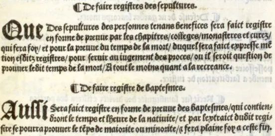 - 1539 : Par l’ordonnance de Villers-Cotterêts (10-25 août 1539) du roi François Ier est prescrit la tenue en langue française, et non plus en latin, par les curés, des registres de baptême.