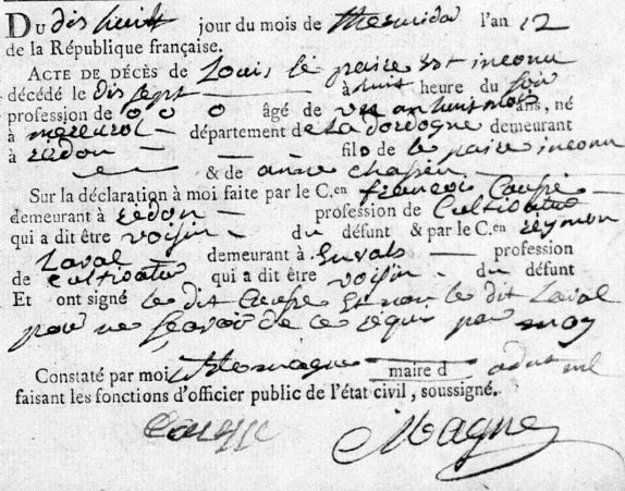 En dépouillant le registre EDT194 de Miers dans le Lot, après le 4 nivôse de l’an 8 (1799), on découvre page 25 (sur les 182 pages du registre) la naissance de Toinette Decros. Jusque là, rien d’extraordinaire. Oui, mais voilà, elle est née le 18 novembre 1773 !