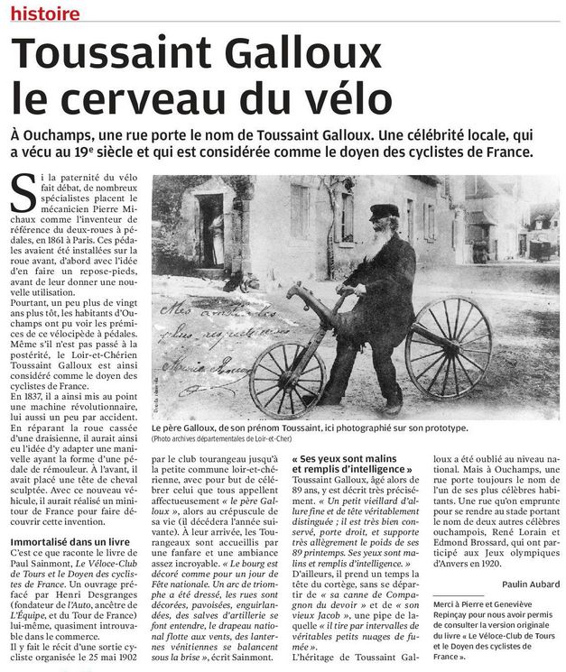Article publié dans La Nouvelle République du Centre Ouest (NRCO) du 22/01/2025 page 6 sous le titre : "Loir-et-Cher : qui était Toussaint Galloux, surnommé le doyen des cyclistes de France ?"