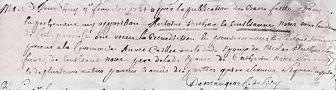 A la recherche de la famille parentale de Antoine Duchard, je trouve bien son acte de mariage avec Emilianne Notet à Ciry-le-Noble le 9 février 1734 comme c’est très souvent indiqué sur les arbres en ligne. Je trouve bien son acte de décès le 19 février 1780 à Ciry-le-Noble mais je ne trouve pas son acte de baptême (vers 1720 puisqu’il semble être mort à soixante ans) et, surtout aucune mention des parents.