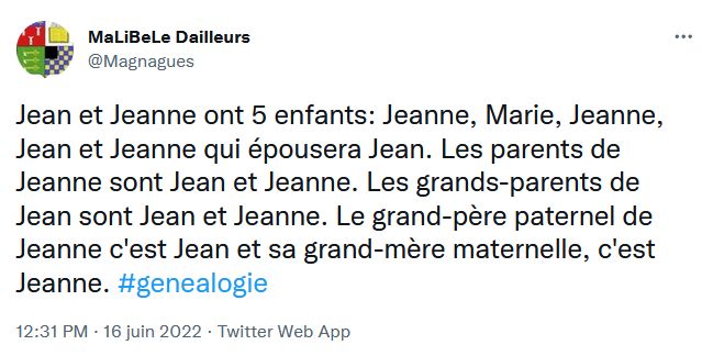 Jean et Jeanne ont 5 enfants : Jeanne qui épousera Jean, Marie, Jeanne, Jean et Jeanne qui épousera Jean. Les parents de Jeanne sont Jean et Jeanne. Les grands-parents de Jean sont Jean et Jeanne. Le grand-père paternel de Jeanne c’est Jean et sa grand-mère maternelle, c’est Jeanne.Avec les noms de famille, cela devient tout de même un peu plus lisible :