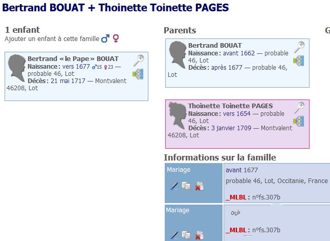 0 @F8007@ FAM 1 MARR 1 MARR 2 DATE BEF 1677 2 PLAC probable 46, Lot, Occitanie, France 2 _MLBL n°fs.307b 1 HUSB @I19669@ 1 WIFE @I2574@ 1 CHIL @I867@J’ai eu l’idée [7] d’aller voir le fichier gedcom. Il y a bien deux familles enregistrées (balise FAMS du gedcom) avec le même couple : Thoinette et Bertrand. Les fiches individuelles (balise INDI du gedcom) ne font référence qu’à un seul des couples.