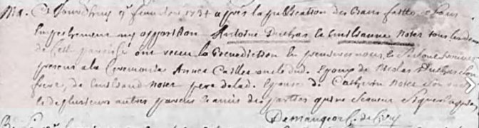 Tiens, c’est bien l’acte affiché dans l’arbre en ligne mais c’est en... 1712 ! Une lecture attentive s’impose et la vérité saute aux yeux : il ne s’agit pas du mariage de Sébastienne et Philibert mais de ceux de deux de leurs enfants !