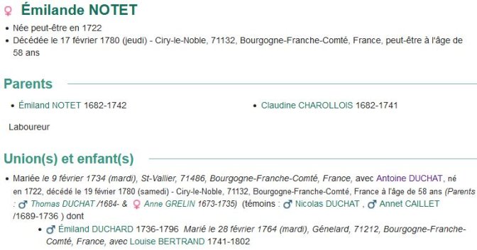 Pour Emilianne Notet ( Consulter la fiche individuelle ), son épouse, j’ai trouvé sa famille parentale, enfin je crois parce que, pour la mère d’Emilianne, rien n’est certain... (mais là aussi, c’est une autre épine quoique elle pourrait peut-être se superposer à celle que je tente de solutionner).