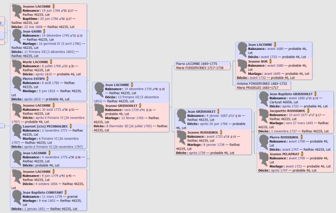 Jean Lacombe 1735-XII et Jeanne Grissoulet /1739/-III ont 5 enfants : Jeanne Lacombe 1766-1808 qui épousera Jean Gaubi 1745-XII, Marie Lacombe 1769-1810/, Jeanne Lacombe 1772-VI VI Voyage Itinérant /, Jean Lacombe 1775- ? et Jeanne Jeanne Lacombe 1779-1856 qui épousera Jean Constant dit Baptiste 1778-1851. Les parents de Jeanne Grissoulet /1739/-III sont Jean Grissoulet 1697-1766/ et Jeanne Rossignol /1723-1739/. Les grands-parents de Jean Lacombe 1735-XII sont Jean Lacombe /1680-/1732 et Jeanne Bor /1680-/1695. Le grand-père paternel de Jeanne Grissoulet /1739/-III c’est Jean appelé Baptiste Grissoulet /1680-1722/ et sa grand-mère maternelle, c’est Jeanne Pelaprat /1708-/1723.C’est plus facile de s’y retrouver et ça reste de la généalogie. La représentation graphique qu’est un arbre est tout de même plus facile à lire.