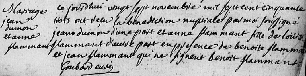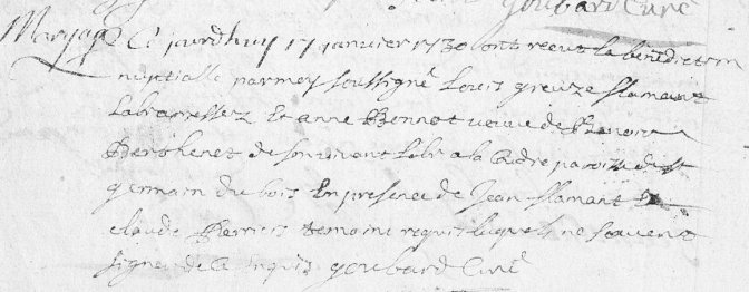 A l’heure qu’il est, cette piste est toujours en voie d’exploration. J’ai arbitrairement choisi le mariage de 1730 mais la porte reste ouverte ( Consulter la fiche média ). En écrivant ça, je me demande si certains ne vont recopier sans se poser de questions... Je prends donc le risque de les emmener sur une fausse piste.