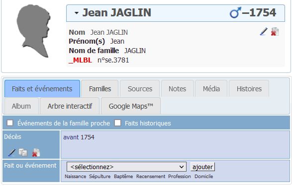 - La deuxième source consultée ne m’affiche rien avec Jean JAGLIN. Dans cet arbre, j’y trouve Jean JACQUELIN, dans un lieu voisin mais au siècle précédent. Ce ne peut donc être lui. Parmi les descendants affichés, pas de Jean (étonnant avec ce prénom généralement plutôt très répandu).