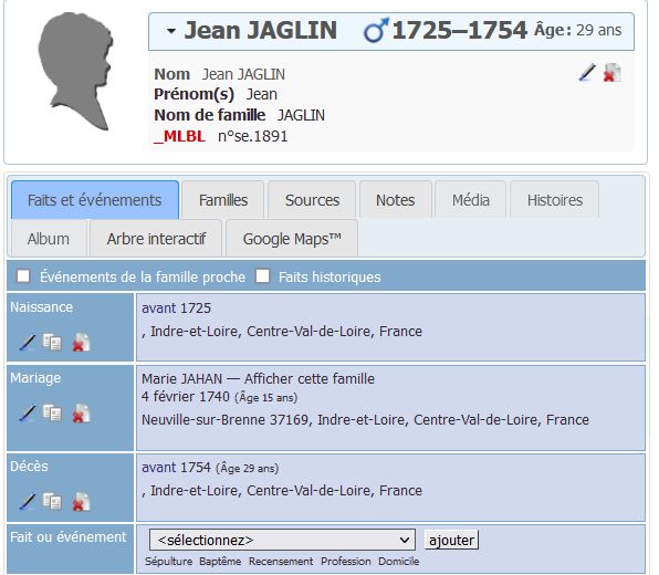 Si j’en crois Nicolas et la fiche individuelle qu’il a réalisée sur le couple, Jean JAGLIN JACQUELIN se serait marié le 8 février 1740 à Neuville-sur-Brenne. L’acte de mariage ne s’avère pas trop difficile à trouver. En voulant passer sur la fiche de Jean JAGLIN depuis celle de Marie JAHAN, je suis surpris de ne pas voir afficher Jean "Jaglin" JACQUELIN mais de lire Jean JAGLIN. Qu’est-ce que c’est que ça ? La réponse est vite évidente : il y a deux fiches différentes ! La réponse à la question initiale est enfin là : c’est l’un des deux mais ce n’est pas le mari de Anne RENARD. Il faut donc supprimer le lien ainsi créé et fusionner alors les deux fiches Jean "Jaglin" ou Jean JAGLIN.