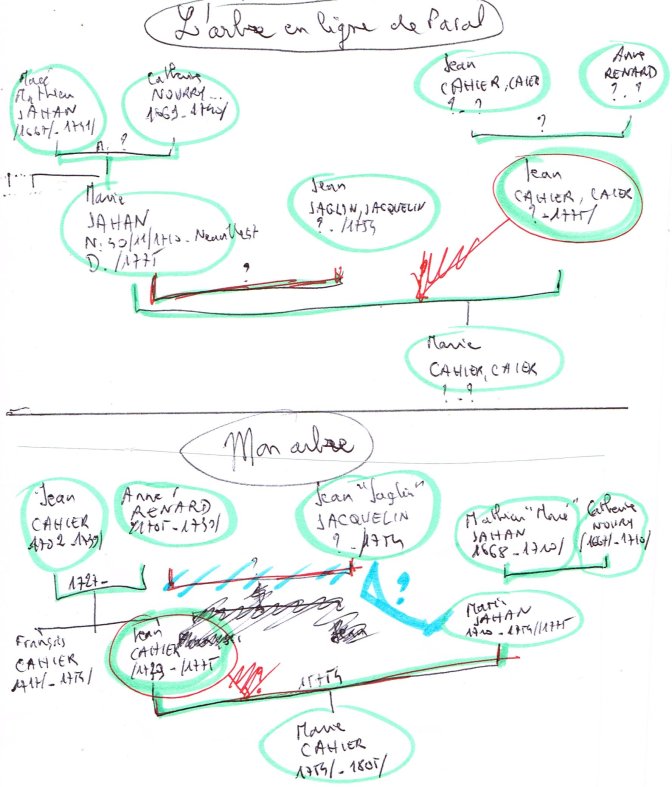 Tout s’embrouille. Il est temps de reprendre... une feuille de papier ! Et, tout de suite, me saute la présence des mêmes personnes mais pas aux mêmes générations et aussi l’existence de deux Jean CAHIER : Jean CAHIER 1702-1739/ ( Consulter la fiche individuelle ) et Jean CAHIER /1739-/1775 ( Consulter la fiche individuelle ). D’après mes données, Jean "Jaglin" JACQUELIN serait décédé avant 1754 et Marie JAHAN aurait épousé Jean CAHIER en 1754.