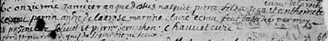 acte de naissance de Pierre CIRAU"Le onzieme janvier an que dessus naquit pierre fils a Jean [cirau] et anthoinete [delaroche] parrin andre de lacrose marrine claire cirau fut baptisée par moy en presence de Solinet (?) et pierre bernachon. present ... requit de signer dit ne seavoir"